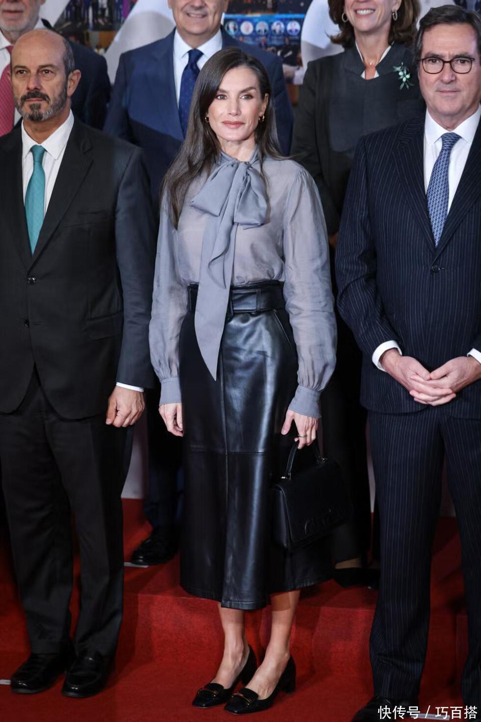 目前处于“深秋季节”的西班牙温度让西班牙王后的穿搭有较大的可塑性,白天平均温度12度以上的时候,西班牙王后选择了一件浅灰色薄纱飘带衬衫,搭配黑色高腰皮裙,精致利落又有女人味,不呆板但也不张扬。