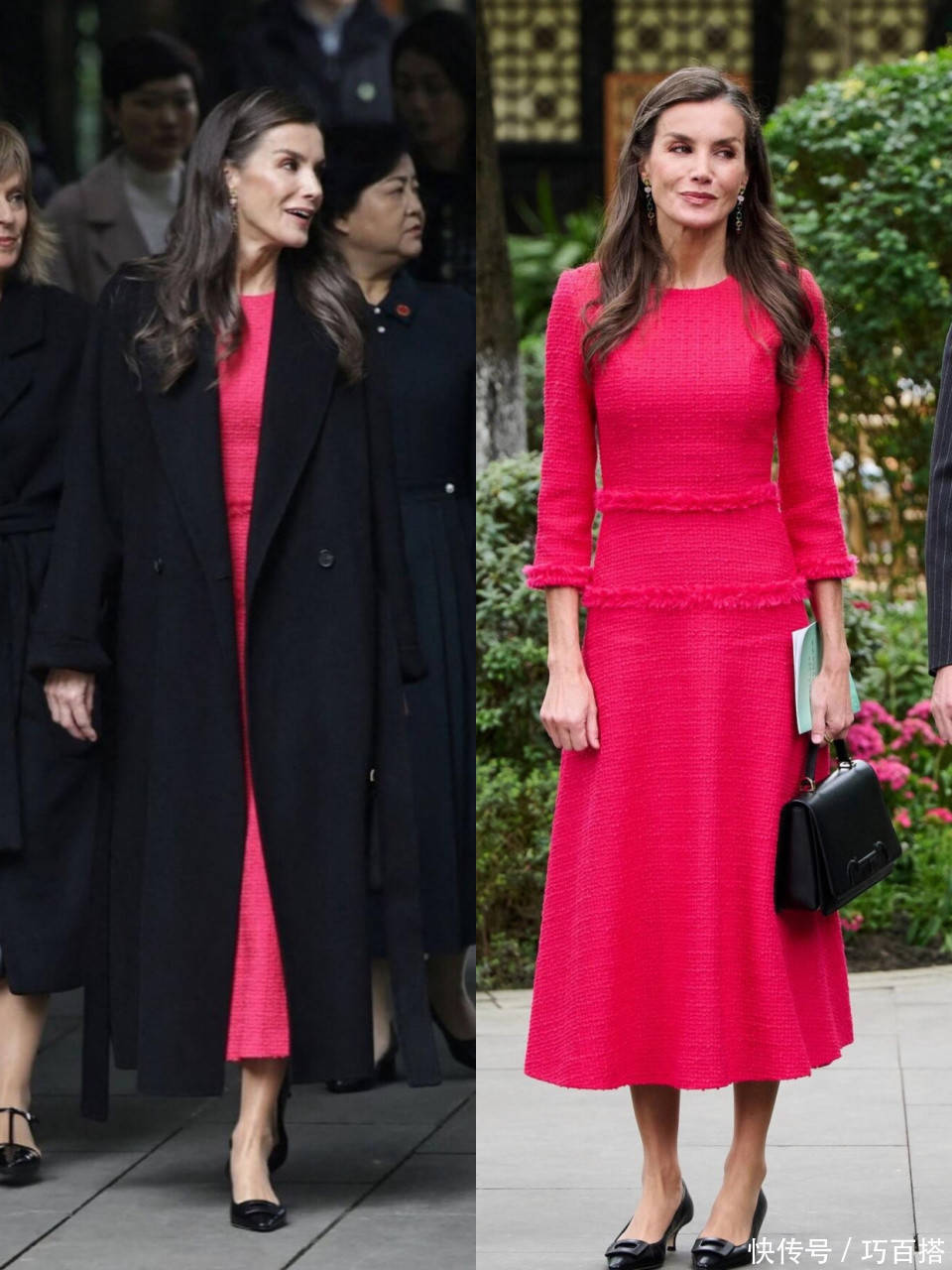 玫红色小香风连衣裙外搭纯黑色大衣,既内敛又奔放,收放自如的上身效果把政治活动变成了时尚活动,感染力一绝。
