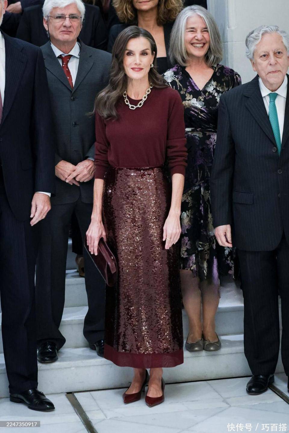 莱蒂齐亚王后的名气完全不输西班牙国王,身穿酒红色西装内搭墨绿色飘带衬衫,精致利落,是真正意义上女性职业装的标配。