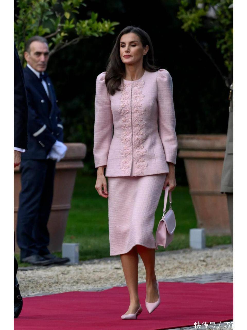 选择灰色牡丹印花大衣时,莱蒂齐亚选择内搭粉色连衣裙,与粉色低跟鞋搭配,和谐统一又不突兀,又美又俏,一点不像53岁的人,状态保持真棒。