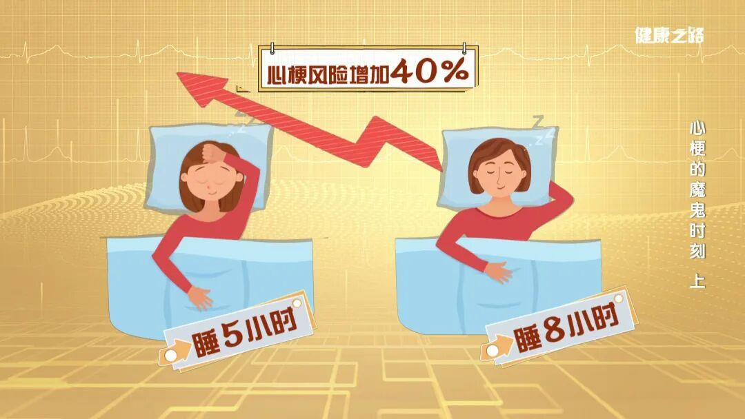 研究显示,每天夜里睡眠时间5个小时的人群比睡8个小时的人群发生心肌梗死的风险增加40%。